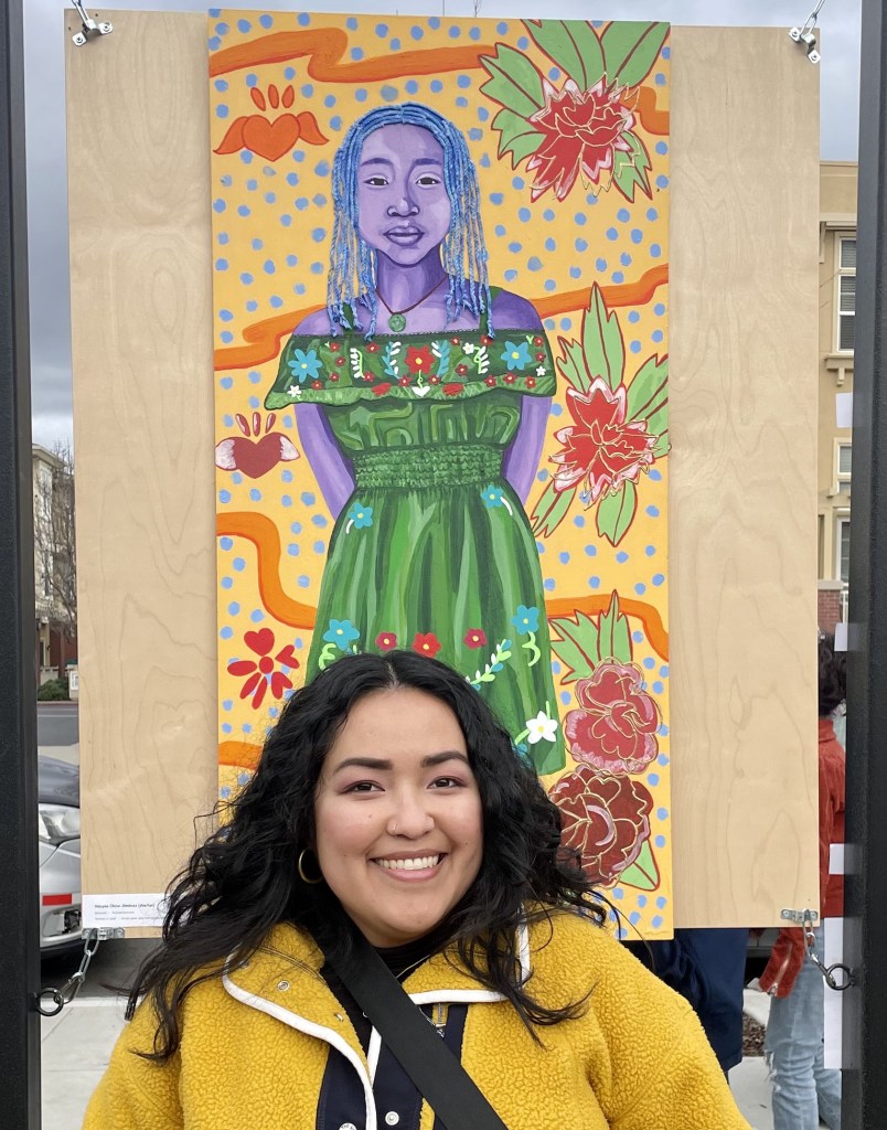 The San José Earthquakes and Adobe asked me to create a mural with the theme of “What does Pride mean to you?” I created the design to represent a flower arch to show how our queer ancestors fought for love equality. The signs represent how far we have come, but also the fight that we must continue to protect trans youth and adults. The soccer balls represent different LGBTQIA+ flags and the flowers are the colors of the progressive flag. My partner and I are in the middle to show our respects to our queer ancestors and to celebrate our love out loud. My partner is sporting the San José Earthquakes’ jersey to pin our location to my hometown of San José, CA.